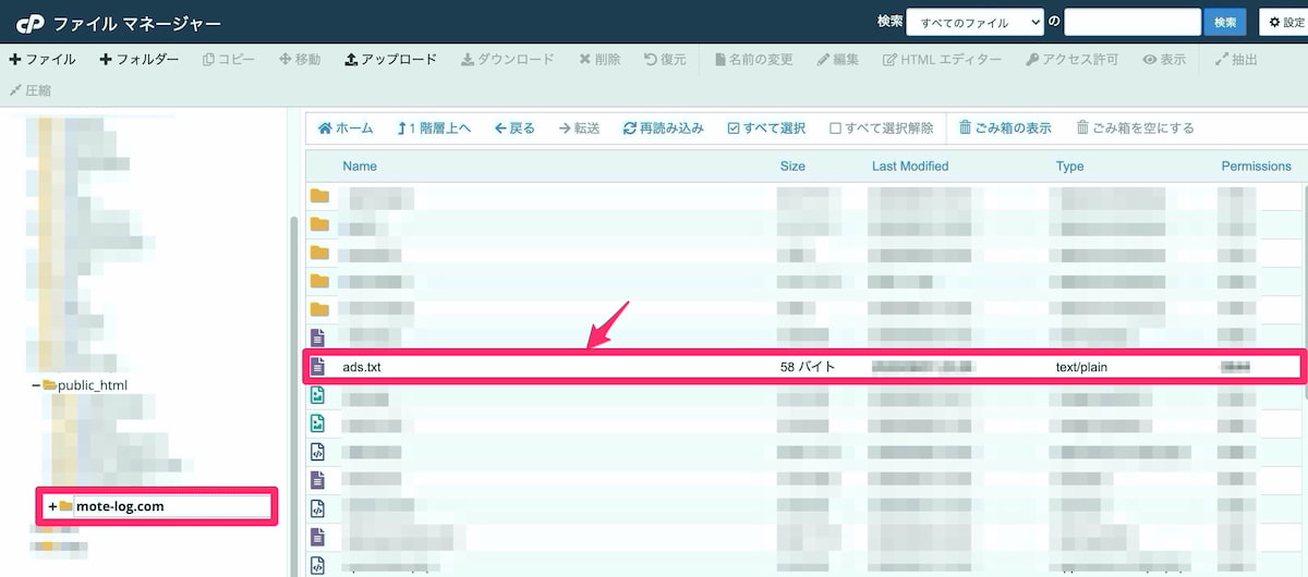 ドメイン(mote-log.com)のルートフォルダ(最上階のフォルダ)に入っていることがわかります。